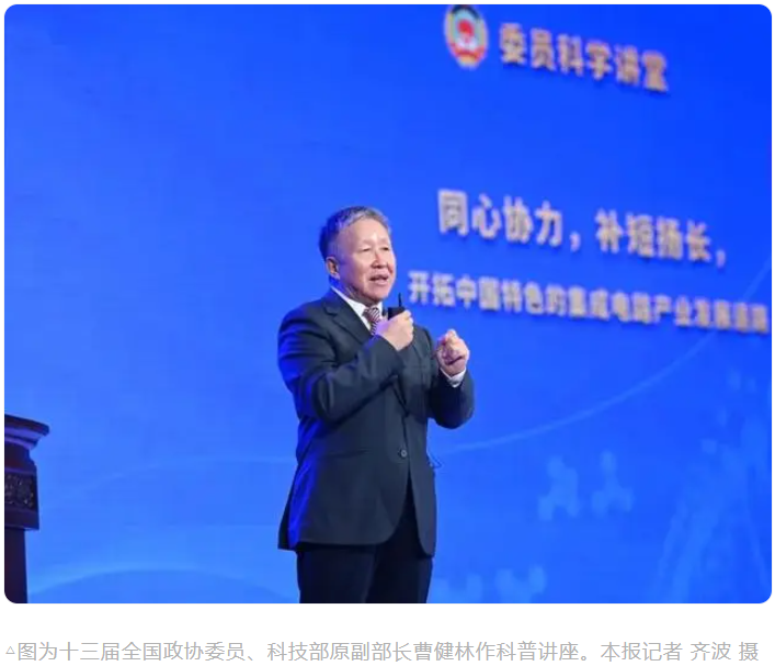 “芯片問(wèn)題是事關(guān)百年發(fā)展的長(zhǎng)期戰(zhàn)略問(wèn)題,不是短期應(yīng)急問(wèn)題,必須持之以恒去發(fā)展。”“要充分發(fā)揮制度優(yōu)勢(shì),集中優(yōu)勢(shì)隊(duì)伍持續(xù)攻關(guān)。”“要敢于開(kāi)辟新賽道,打造新生態(tài),推進(jìn)‘再全球化’。”……9月25日下午,寬敞明亮的全國(guó)政協(xié)禮堂里,十三屆全國(guó)政協(xié)委員、教科衛(wèi)體委員會(huì)副主任曹健林正站在舞臺(tái)中央巨大的顯示屏前,以“同心協(xié)力,補(bǔ)短揚(yáng)長(zhǎng),開(kāi)拓中國(guó)特色的集成電路產(chǎn)業(yè)發(fā)展道路”為題,為坐在臺(tái)下的全國(guó)政協(xié)委員、地方政協(xié)委員、高校學(xué)生、科研工作者等700余名觀眾作科普講座。