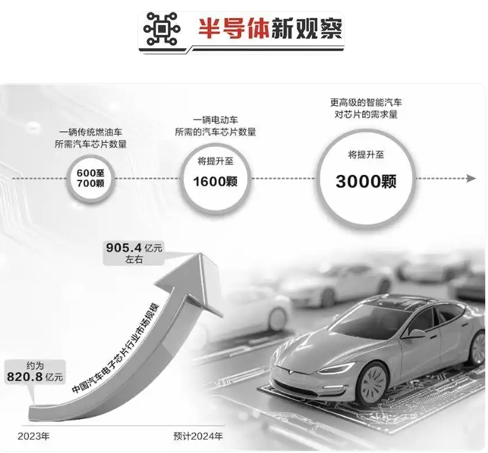 據(jù)機構(gòu)預測,2023年中國汽車電子芯片行業(yè)市場規(guī)模約為820.8億元,預計2024年增至905.4億元左右。