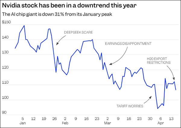 “今年,英偉達(dá)投資者都無(wú)法獲得喘息。”美國(guó)“商業(yè)內(nèi)幕”網(wǎng)站17日分析稱,今年接二連三的事件都在打擊英偉達(dá)的股價(jià),從DeepSeek需要更少人工智能芯片的系統(tǒng)、特朗普的關(guān)稅政策到最新的出口限制措施,該股今年迄今已下跌逾20%,相較于1月高點(diǎn)下跌約30%,跌幅遠(yuǎn)超科技公司占大頭的納斯達(dá)克100指數(shù)。市場(chǎng)對(duì)英偉達(dá)股票的擔(dān)憂加劇。