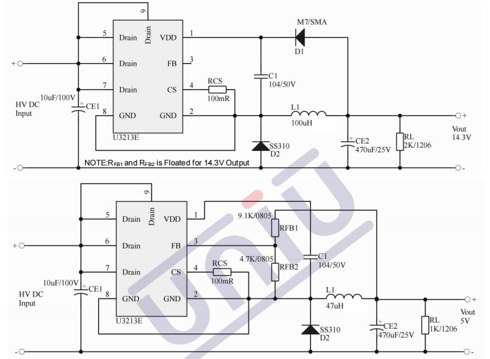 •產(chǎn)品描述:U3213E是一款高性能低成本PWM控制功率器,適用于離線式小功率降壓型應(yīng)用場(chǎng)合,外圍電路簡(jiǎn)單、器件個(gè)數(shù)少。同時(shí)產(chǎn)品啟動(dòng)模塊內(nèi)置高耐壓MOSFET可提高系統(tǒng)浪涌耐受能力。與傳統(tǒng)的PWM功率開關(guān)不同,U3213E內(nèi)部無固定時(shí)鐘驅(qū)動(dòng)MOSFET,系統(tǒng)開關(guān)頻率隨負(fù)載變化可實(shí)現(xiàn)自動(dòng)調(diào)節(jié)。同時(shí)芯片采用了多模式PWM控制技術(shù),有效簡(jiǎn)化了外圍電路設(shè)計(jì),提升線性調(diào)整率和負(fù)載調(diào)整率并消除系統(tǒng)工作中的可聞噪音。此外,芯片內(nèi)部峰值電流檢測(cè)閾值可跟隨實(shí)際負(fù)載情況自動(dòng)調(diào)節(jié),可以有效降低空載情況下的待機(jī)功耗。U3213E集成有完備的帶自恢復(fù)功能的保護(hù)功能:VDD欠壓保護(hù)、逐周期電流限制、輸出過壓保護(hù)、過熱保護(hù)、過載保護(hù)和VDD過壓保護(hù)等。
