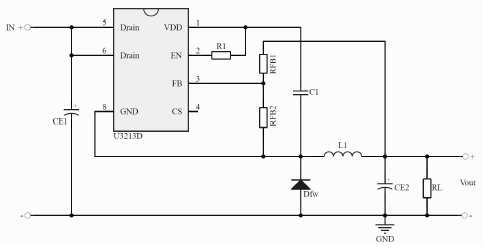 •主要特點:集成3A 150V MOS;集成 200V 高壓啟動電路;集成限流電阻(默認1.2A);使用范圍:VIN-VOUT>3V,Ipk<2A;默認15V輸出(FB腳懸空);低功耗模式工作;支持降壓和升降壓拓撲;待機功耗低于 50mW;良好的線性調(diào)整率和負載調(diào)整率;集成軟啟動電路;內(nèi)部保護功能;過載保護(OLP);逐周期電流限制(OCP);輸出過壓保護(OVP);VDD 過壓、欠壓和電壓箱位保護