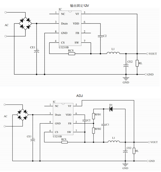 •主要特點:集成9Ω,500V MOS ; 集成650V 高壓啟動電路 ; 集成續(xù)流二極管 ; 多模式控制、無異音工作 ; 支持降壓和升降壓拓撲 ; 默認12V 輸出( FB 腳懸空) ; 待機功耗低于50mW ; 良好的線性調(diào)整率和負載調(diào)整率 ; 集成軟啟動電路 ; 內(nèi)部保護功能:過載保護 (OLP) 、 逐周期電流限制 (OCP) 、 輸出過壓保護 (OVP) 、 VDD 過壓、欠壓和電壓箝位保護