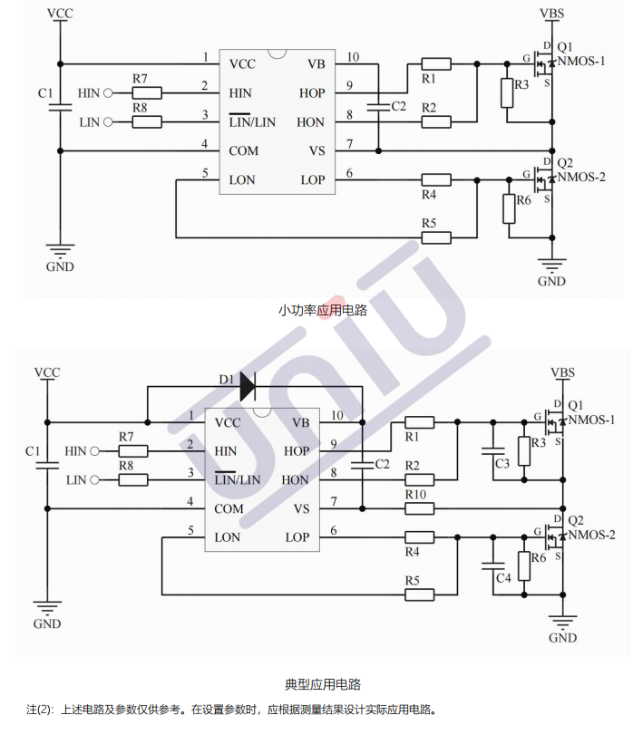 •主要特點(diǎn): 集成自舉二極管(1) ;高端懸浮自舉設(shè)計(jì);最高工作電壓可達(dá)+300V ;負(fù)瞬態(tài)電壓承受能力;支持柵極驅(qū)動(dòng)電壓從9到20V ;VCC/VBS欠壓保護(hù)(UVLO) ;兼容3.3V,5V輸入邏輯 ;內(nèi)置直通防止和死區(qū)時(shí)間;芯片傳輸延時(shí)特性