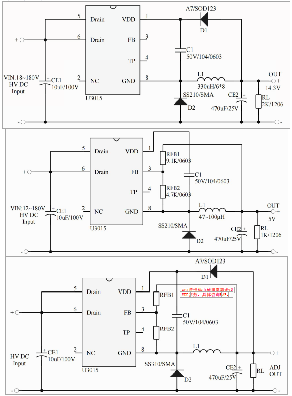 •主要特點(diǎn):WN: 12~180V(OUT:ADJ);集成 2.5A 180V MOS;集成 200V 高壓啟動電路;多模式控制、無異音工作;支持降壓和升降壓拓?fù)?默認(rèn)14.3V 輸出(FB 腳懸空);待機(jī)功耗低于 50mw;良好的線性調(diào)整率和負(fù)載調(diào)整率;集成軟啟動電路;內(nèi)部保護(hù)功能:過載保護(hù)(OLP);逐周期電流限制(OCP);輸出過壓保護(hù)(OVP);VDD 過壓、欠壓和電壓箝位保護(hù)。