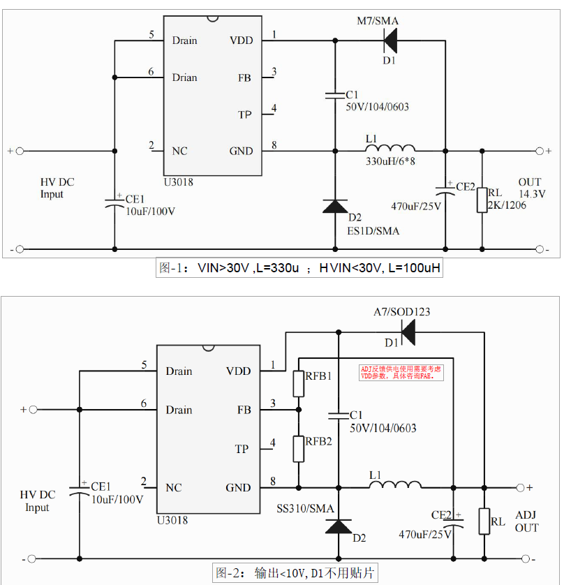 •主要特點:VIN: 18~180V(OUT: 14.3V);集成 2.5A 180V MOS;集成 200V 高壓啟動電路;多模式控制、無異音工作;支持降壓和升降壓拓撲;默認14.3V 輸出;待機功耗低于 50mw;良好的線性調(diào)整率和負載調(diào)整率;集成軟啟動電路;內(nèi)部保護功能:過載保護(OLP);逐周期電流限制(OCP);輸出過壓保護(OVP);VDD 過壓、欠壓和電壓箱位保護